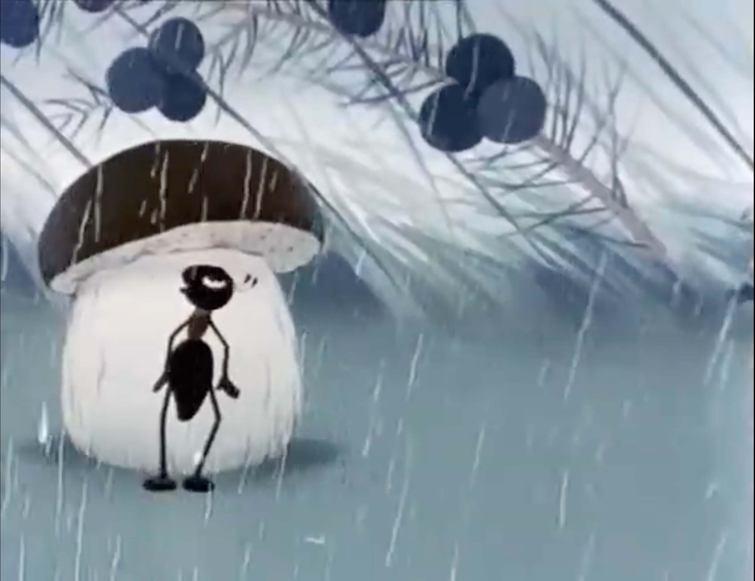 Cinq petits animaux de la forêt, rassemblés sous les champignons par la pluie, réussissent à effrayer un renard…