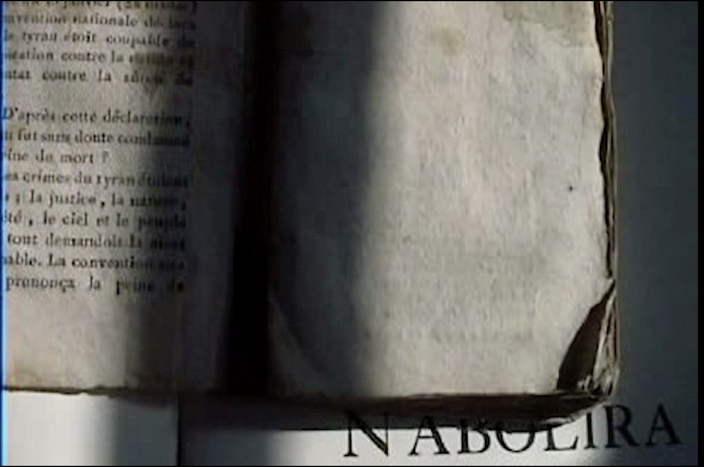 Une édition du XVIIIe siècle des Mille et une nuits a pour couverture une page de journal, celle qui relate la séance du 15 Janvier 1793 de la Convention Nationale, où fut votée la mort du roi. Le livre est posé sur une page du Coup de dés de Mallarmé : la page « N’ABOLIRA ». Le texte est transporté, extrait de la vidéo numérique, il devient image fixe d’un fichier jpeg puis de nouveau matière (papier+imprimante). Le vernis le rend imperméable, entraîne des particules d’encre, imprime le geste, des couleurs disparaissent, parfois une monochromie s’impose…C.C.