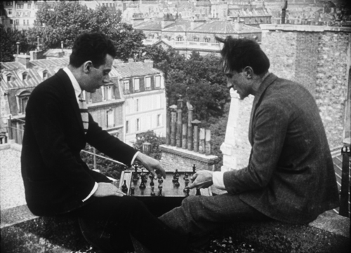 Deux hommes emmitouflés comme pour un voyage en plein air par temps froid, sont assis à un bar. C’est janvier, à Paris. Leurs traits sont estompés par les bas qui leur recouvrent la tête. Ils jouent aux dés pour savoir s’ils vont partir ou non. Les dés sont favorables. Ils sortent et se dirigent vers une voiture qui les attend. On voit leur haleine qui filtre à travers les bas. Ils partent pour une destination inconnue. La voiture quitte Paris, traverse des fortifications démolies et bondit sur des routes inégales. Puis ce sont les routes nationales, toutes lisses qui conduisent vers le sud. Le sol est couvert de neige, mais la voiture roule à vive allure ; il n’y a pas de circulation. Un rare camion, un train au loin -rien d’autre ne vit. Vers le sud, les peupliers et oliviers commencent à apparaître et les platanes sans feuilles, aux branches brutalement tronquées, semblent sortir des premiers tableaux cubistes. En entrant dans une petite ville, on aperçoit, sur une colline qui la domine, un château cubiste. La voiture suit, jusqu’au château, un chemin en spirale et pénètre à l’intérieur par une ouverture percée à même le mur, sans portail. L’on découvre alors une vaste pelouse entourée d’un mur dont les ouvertures espacées, rectangulaires, encadrent le paysage alentour. On se croirait dans une galerie avec des tableaux aux murs. Il n’y a de vie nulle part… Ayant commencé à tourner et ne sachant pas trop où j’allais, il me semblait que j’avais réussi à créer une atmosphère mystérieuse… (Autoportrait)