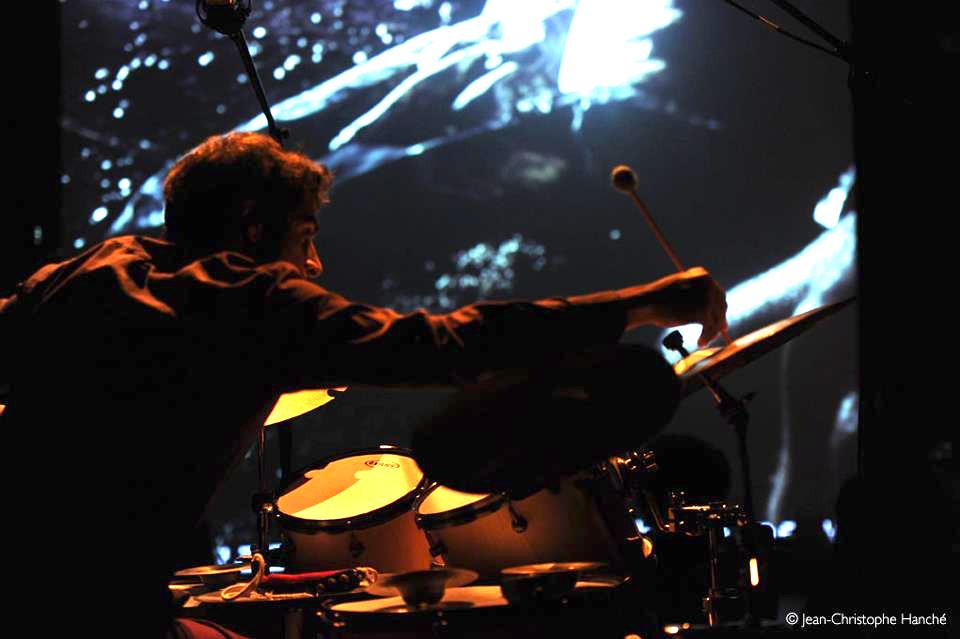 Ici la batterie énonce des phonèmes musicaux, des fragments de langage qui ne donnent sens que dans la durée… Elle contrôle le temps musical et visuel, offrant en temps réel un collage absurde, politique et violent, drôle mais vertigineux, montrant quelques unes des strates de pliages psychologiques dans lesquelles nous nous retrouvons parfois pris en étau.