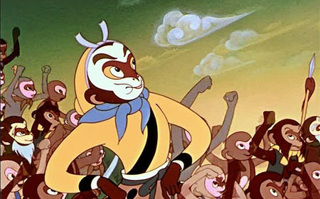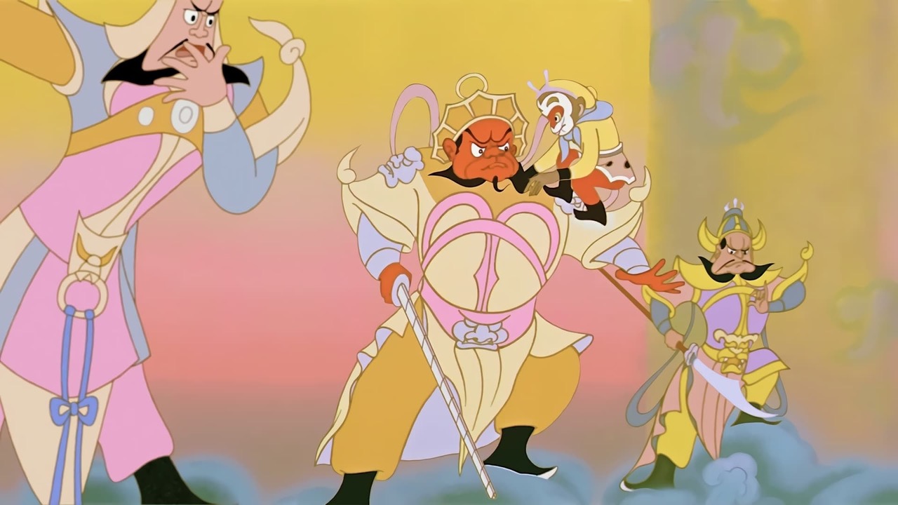 Synopsis : Le roi des singes s’est empare d’une arme magique, « la règle à dompter les flots ». Un complot s’ourdit contre lui et il est fait prisonnier. Seulement, il est immortel et personne ne peut rien contre lui. Ce dessin animé fut interdit en Chine pendant la révolution culturelle car l’empereur céleste et despote ressemblait, d’après les gardes rouges, par trop au président Mao.
