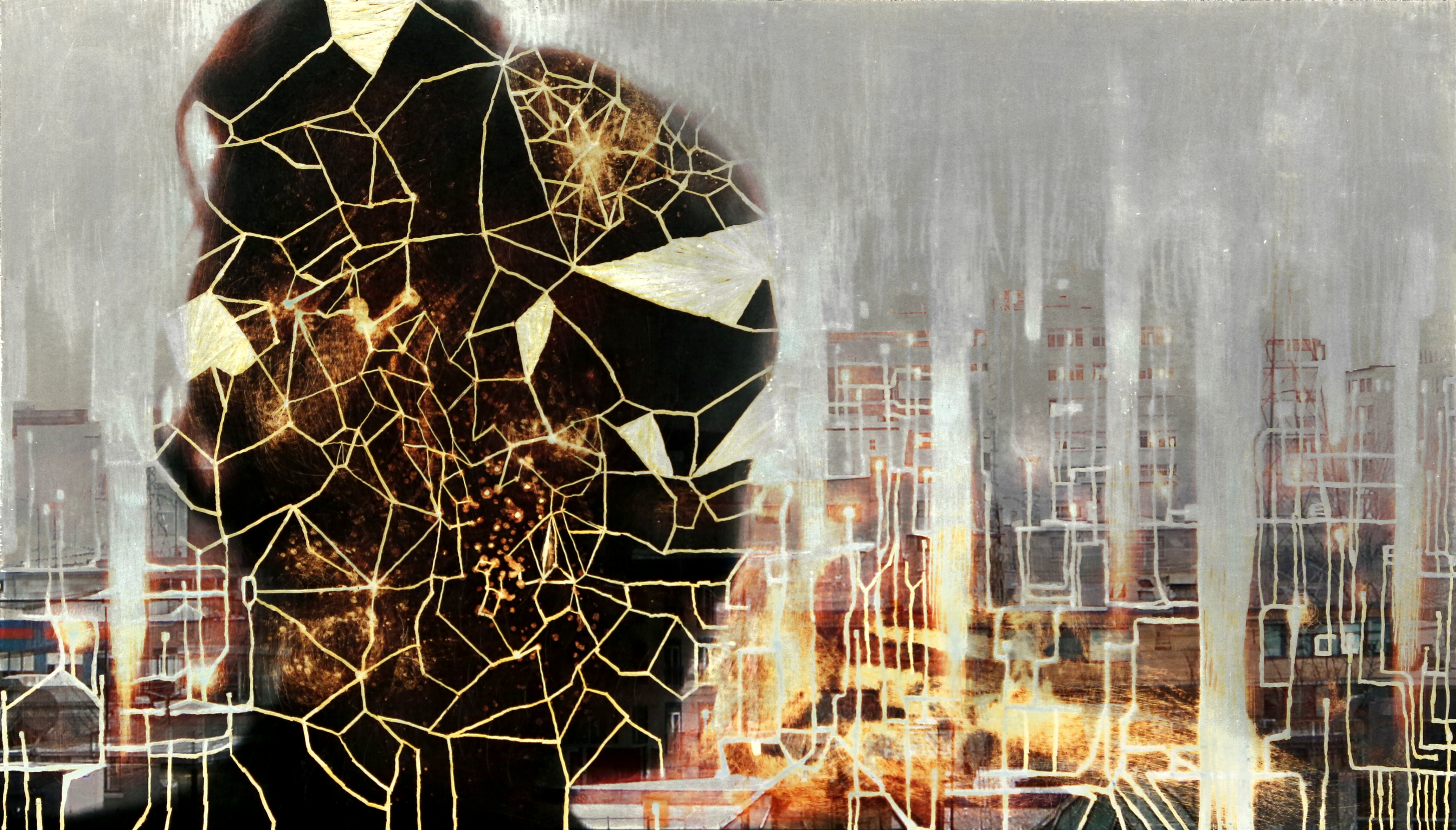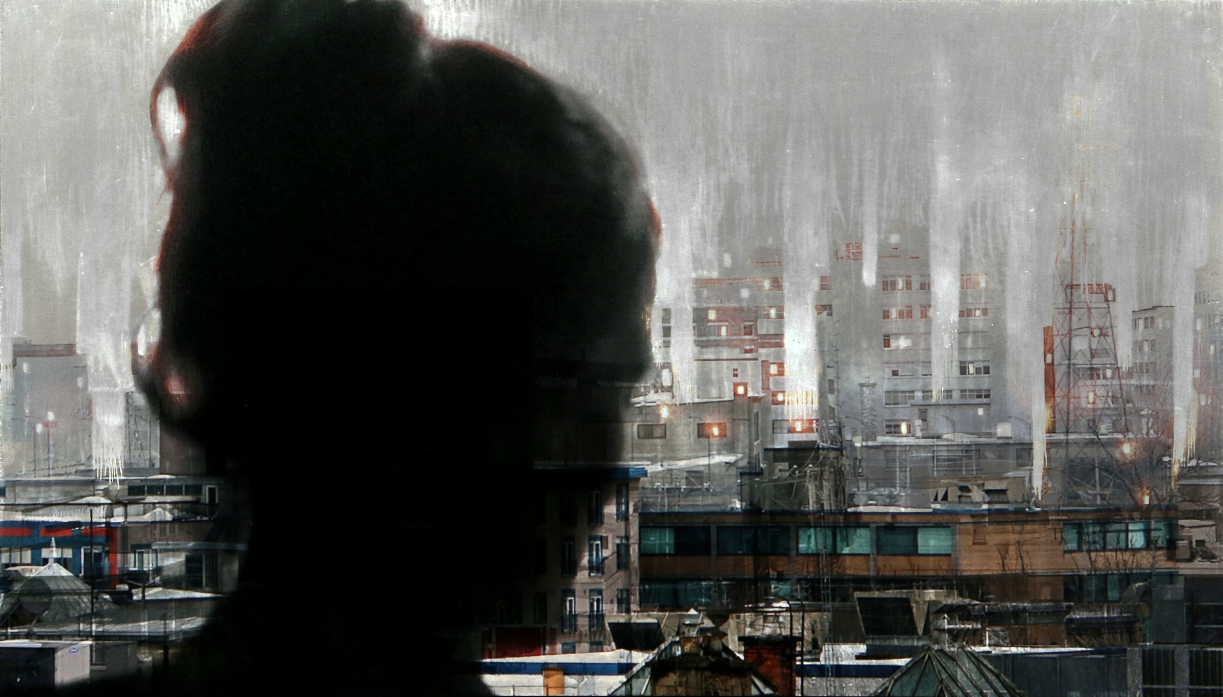 Une jeune femme voit et capture, développe et gratte. Elle recoud des images. Technique mixte de la ville en fragments.
