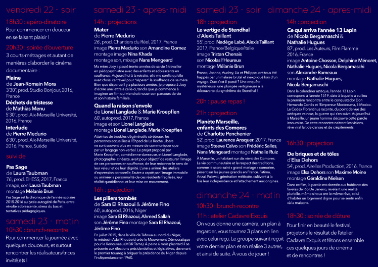 Cette année, nous vous proposons 11 films documentaires, pensés, réalisés ou produits par des professionnels issus du Master « Métiers du Film Documentaire » de l’Université Aix-Marseille. Toutes les séances sont à entrée libre et seront suivies d’une discussion, en présence des réalisateurs et de leurs équipes techniques.