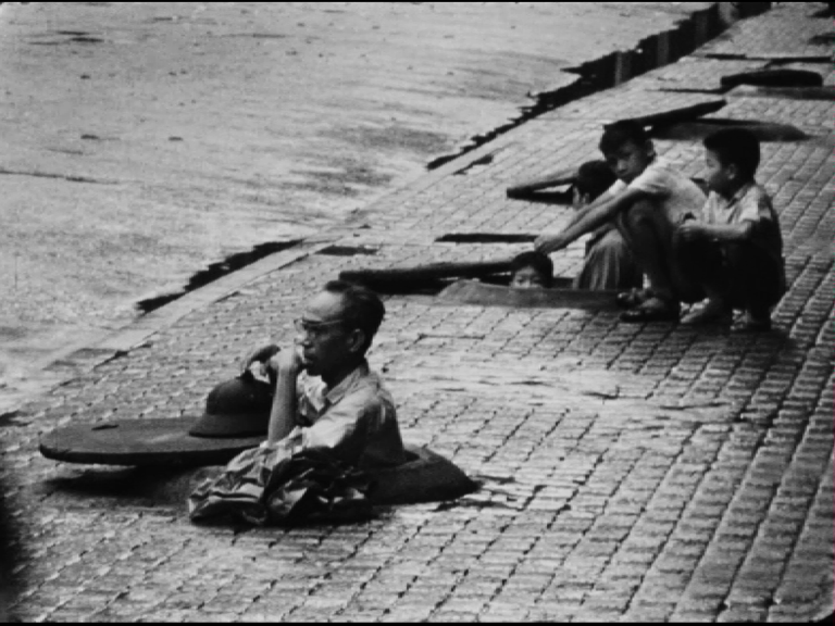 À Hanoï, chacun reprend ses activités là ou ils les avaient interrompues. Ici les femmes ont repris la construction des abris individuels en béton, ; et sur le panneau, le vieux peintre va pouvoir maintenant inscrire le chiffre des avions abattus ce jour : 2.