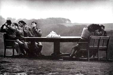 Une troupe volubile, le corps bruni comme sous l’effet d’une grande chaleur, danse en s’invectivant dans un dédale de parois mobiles bleutées et festoie dans le vent au bord d’une falaise.