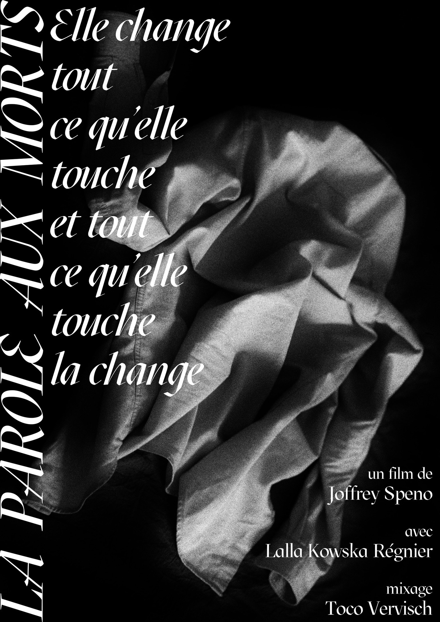 La parole aux morts est une série de films réalisés par Joffrey Speno. Il est sans doute inédit qu’un jeune cinéaste commence par une série de ce type, avec des partis pris aussi radicaux : à chaque fois, filmer en plan fixe, selon une durée variable, une seule personne parlant de son rapport à la mort, parlant de ses morts, de la mort qui est en elle.