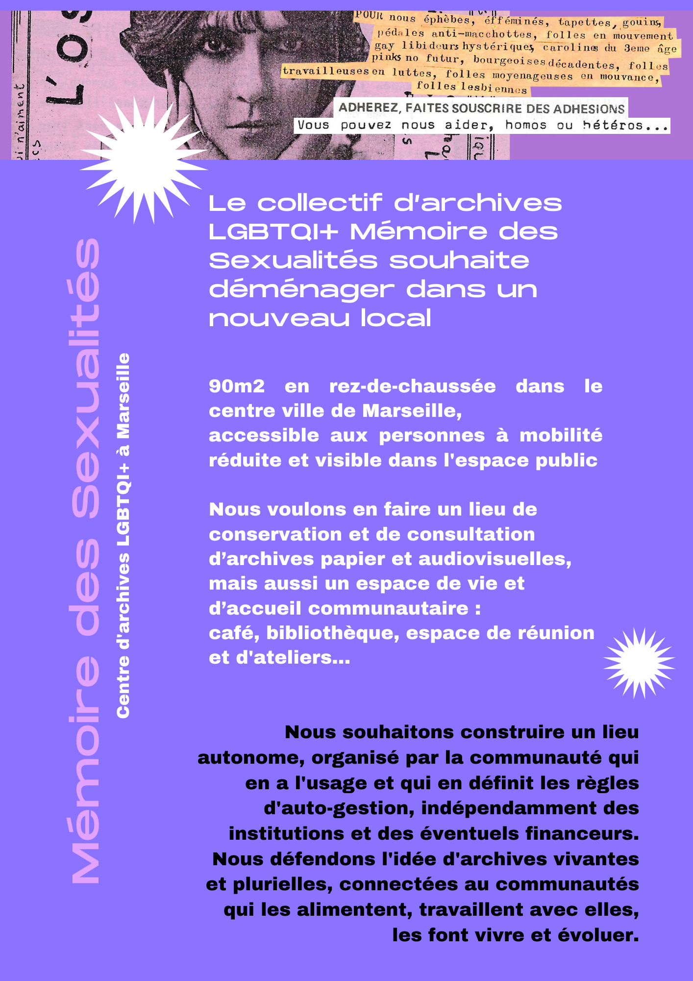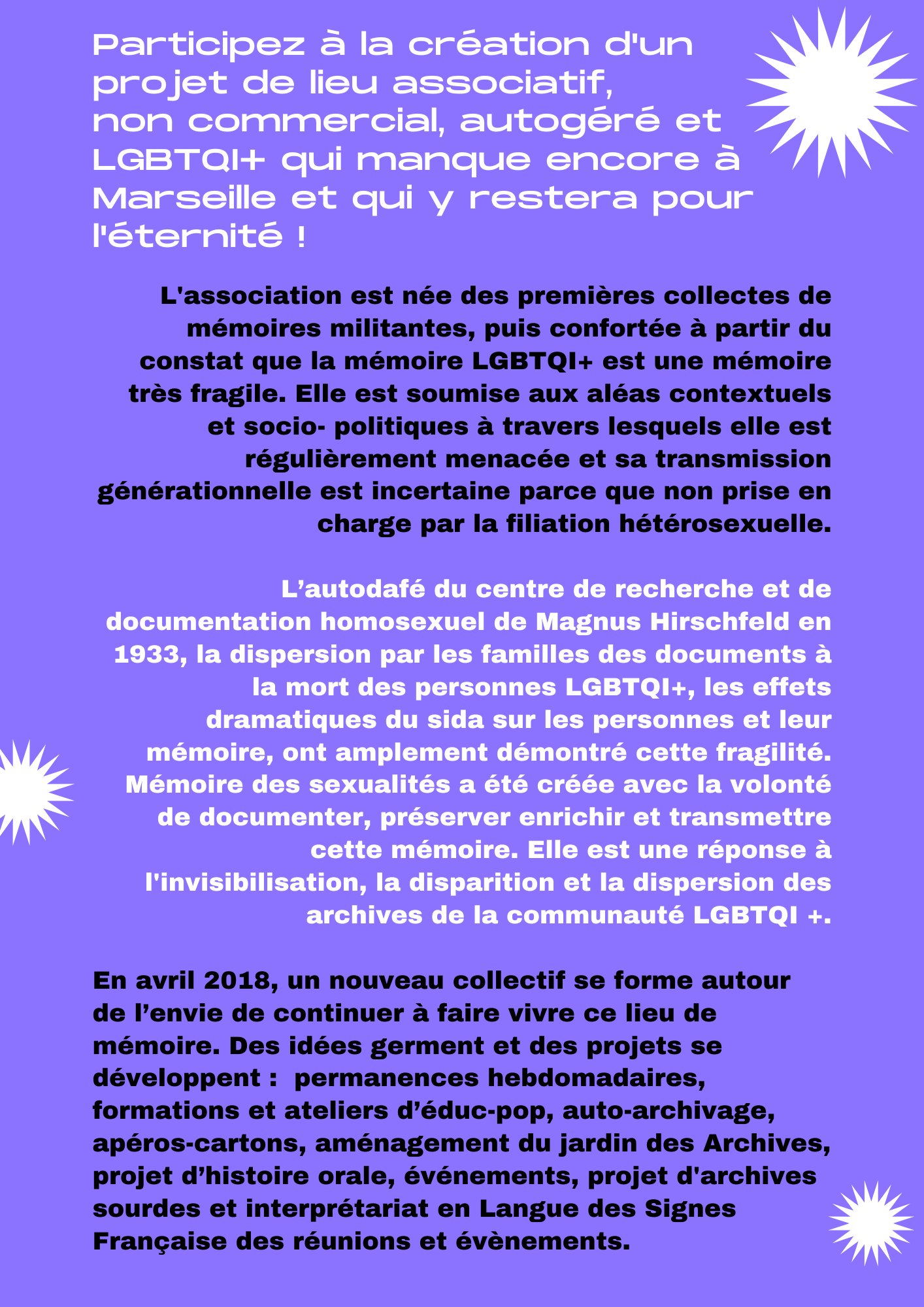La recette du prix libre sera entièrement versée à Mémoire des Sexualités, actuellement en appel à dons pour l’acquisition d’un local en centre ville de Marseille dédié aux archives LGBTQI+