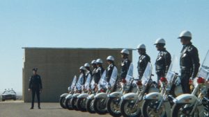 Enfin, Electra Glide in Blue (1973). Faux road-movie, premier film de James William Guercio. John Wintergreen, jeune policier. Bécane rutilante, produit de marque au service de la loi. John Wintergreen fasciné par ses supérieurs, croit en l’autorité. Une lobotomie générative d’une sorte de malaise inavouable. La loi comme ultime/unique jalon. Il ne peut croire en rien d’autre. Son monde est trop naïf et vide pour opérer une prise de conscience. L’ordre sera, dans sa logique, le pont de corde possible entre les communautés hippies repliées et persécutées, et les autres, ces conservateurs chevronnés des certitudes nixonniennes. Ce film va encore plus loin dans la désillusion. A l’inverse d’Easy Rider où les protagonistes « peace and love » étaient descendus par des red neck, ce sont les défenseurs initiaux du Flower Power, les beatniks, qui à leur tour tueront le représentant de la discipline et du maintien de la sécurité. Un renversement de situation tragique qui décrit et dénonce subtilement, par déviance et déviation progressives, la destruction de ce qui a été rêvé, de ce qui a été le songe d’une nuit d’été…