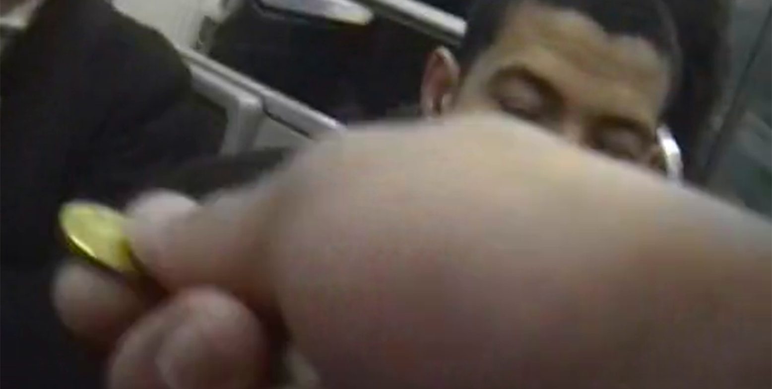 Alors qu’il était encore étudiant en art, Iván Argote a filmé une de ses performances en caméra cachée. En un plan séquence, il nous embarque dans le métro parisien où qu’il retourne une situation tristement habituelle : il se met en scène non pas pour demander de l’argent mais donner 10 centimes aux usagers de métro. 1 minute 40, où il n’essuie que des refus. Depuis son point de vue, nous subissons les regards gênés, jusqu’à l’arrivée à la station Saint Sulpice, dénommée d’après ce saint réputé pour être « le pieux » ou « le bon » d’après ses actions éducatives en faveur des enfants de familles pauvres. Avec un humour grinçant, en un geste simple, le film interroge notre rapport à l’autre dans l’espace public.
