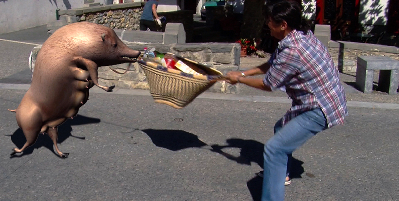 Un couple de cochons bien roses en images de synthèse débarque à Irissarry, un village basque traditionnel, semant le trouble parmi les habitants. Selon un dispositif aussi ingénieux, littéral que cocasse, voilà les villageois confrontés aux cochons virtuels, créant des situations déstabilisantes. Sous un humour porcin gras et provocateur, Bertrand Dezoteux met en scène un choc entre tradition et modernité, réalité et virtualité, questionnant les traditions basques comme l’impact du tourisme.