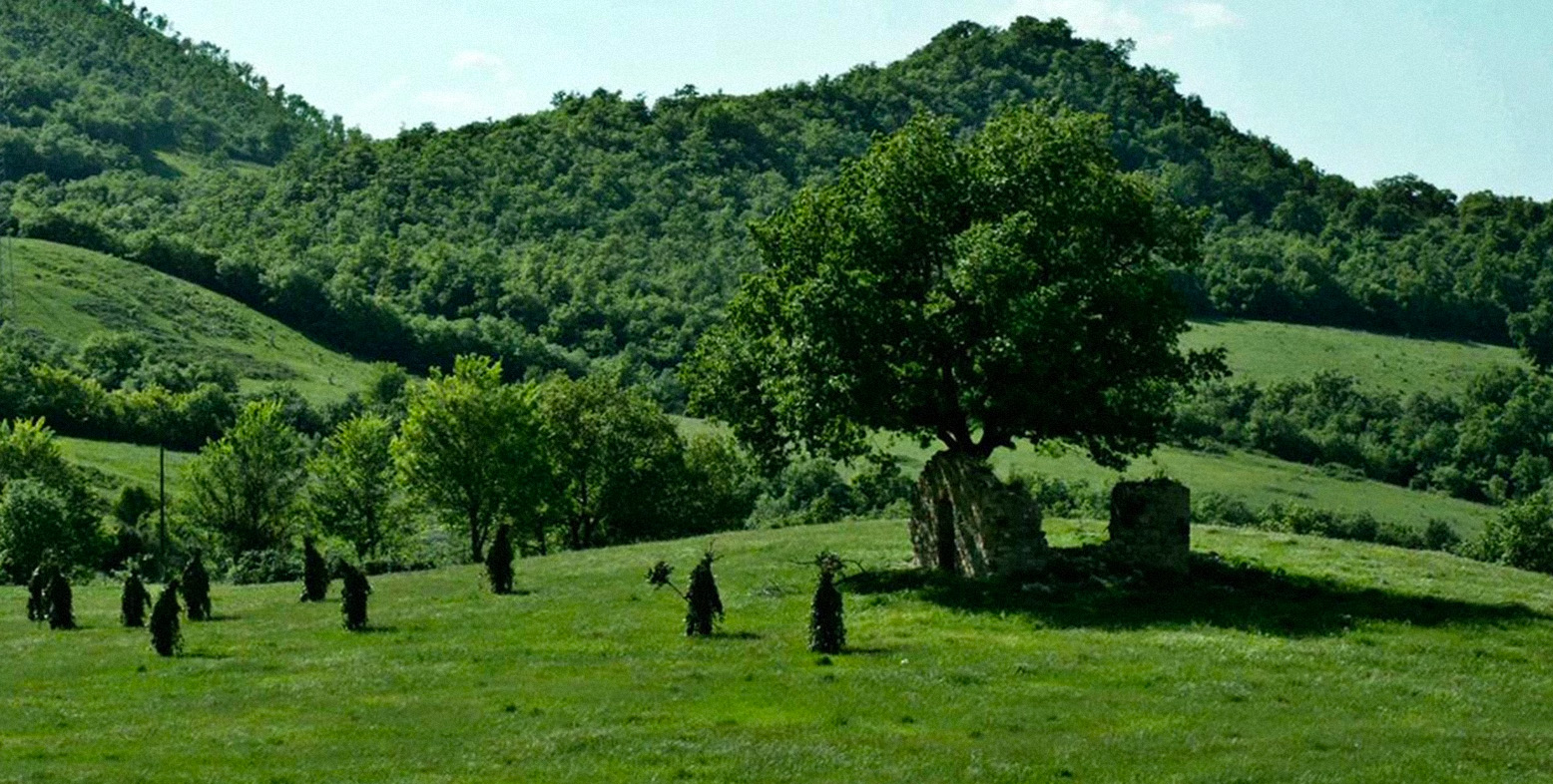 Our eyes open again and we find ourselves looking upwards through the undergrowth as an ancient ritual unfolds under the warm sun of the south Italian countryside. We bear witness to the staged ethno-document of Alberi, an installation-come-film that follows the villagers of the Basilicata region as they move from forest to village in celebration of the yearly fusion of man and earth. In Italian visionary filmmaker Michealangelo Frammartino’s construction, the lost mythic character of the Romito is recovered and reanimated, brought back to eternal life through the eyes and ears of cinema.