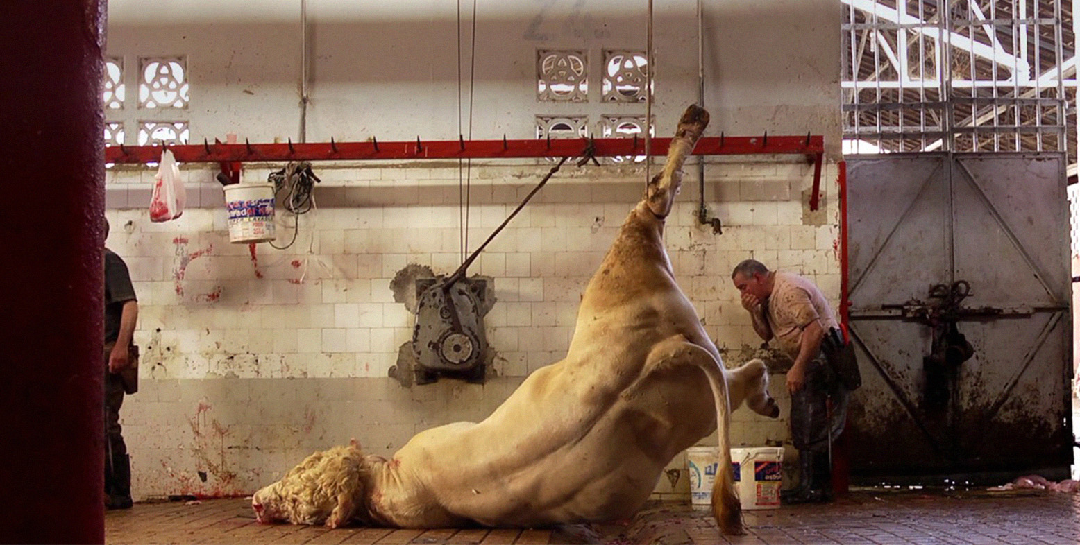 Pour cette session, Double Vision glisse au samedi 21 mars pour clore la première session de BAAB, programme de 12 mois qui se destine aux artistes, cinéastes et chercheurs travaillant sur des projets audiovisuels à la croisée de l’art, de l’anthropologie et du cinéma. À la suite de la masterclass donnée samedi matin à 9h30 par Hassen Ferhani autour de ses films et de sa méthodologie de travail, nous poursuivrons au soir avec la présentation en sa présence de Dans ma tête un rond-point, son magnétique premier métrage. Document, portrait d’un abattoir non comme un lieu de mort mais comme un lieu de vie comme de travail (ou l’inverse ; que serait un travail vivant ?), de ses habitants et de ses ouvriers, aventure formelle imprégnée des questions sociales et politiques algériennes, Dans ma tête un rond-point ne cesse d’étonner dans sa capacité à rester disponible à l’humain comme au réel dans ses surgissement les plus difficiles et contradictoires en un tel lieu (la répétition du geste et l’abrutissement, le labeur, la viande, l’animal, et la mise à mort, l’absurdité, l’ombre… la lumière des êtres). Et son beau titre reste en tête une fois lu, entendu, vu comme une obsession, la ritournelle… Dans la tête nos ronds-points…. Pour l’accompagner, Castro street, poème visuel de Bruce Baillie autour de l’ancienne artère traversant la zone industrielle de Richmond, en Californie, de l’autre côté de la baie de San Francisco. Une zone de réservoirs de stockage de pétrole et de gares de triage qui évoque la tension de l’industrialisation entre puissance et désastre, l’espace liminaire entre nature et culture, celle qui pour Bruce Baillie a engagé l’existence de la vie dite moderne sans laquelle le cinéma n’existerait paradoxalement pas.