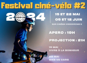 Poursuivant ses activités itinérantes, l’équipe de CycloLab a le plaisir de vous (re)présenter CinéVélo ! Pour la deuxième année, en collaboration avec le Videodrome 2, une série de soirées cinés-vélo seront organisées durant les mois de mai et juin.