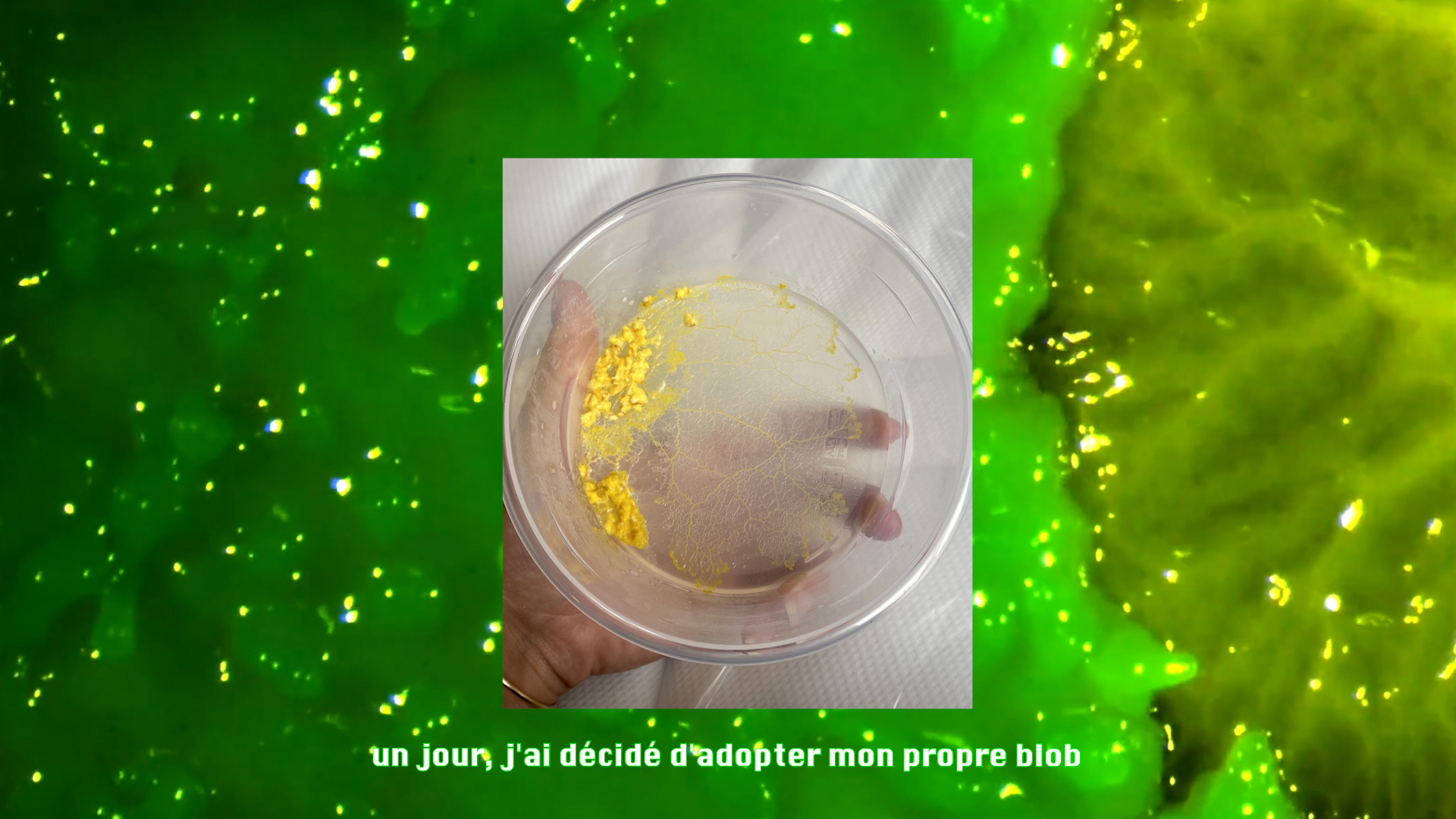 Alors que mon cerveau est à deux doigts du court-circuit, je continue de scroller mes écrans jusqu’à découvrir l’existence d’une créature qui m’hypnotise, le blob. Au-delà de sa beauté et de sa fluidité, le blob incarne une simplicité d’être au monde que je lui envie. Je décide alors d’adopter Blobby, avec qui je noue une relation profonde, affective et thérapeutique. Alors que Blobby étire ses longs bras gluants avec grâce et sérénité, je suffoque, je surchauffe, je déborde. Blobby m’apaise.