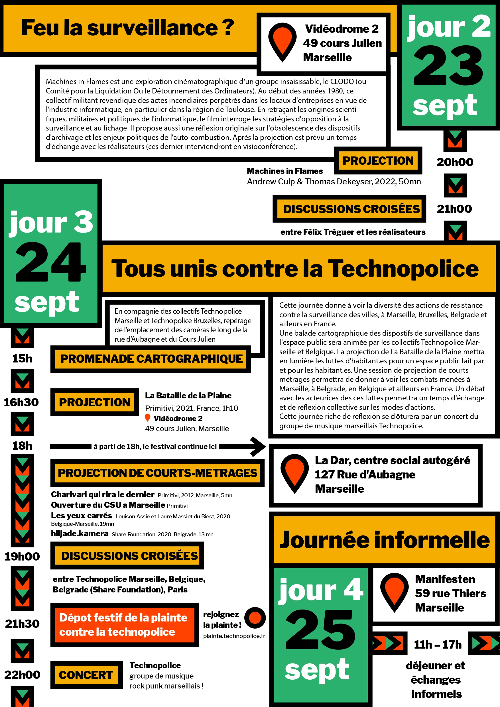 Face à la surveillance totale de l’espace public, il est urgent de se réapproprier les luttes passées et de renforcer celles présentes pour résister et penser nos futurs désirables. De Marseille à Paris, de Bruxelles à Belgrade, de Baltimore à Toulouse, ce festival, à travers des films, des débats et des rencontres avec les acteurices des ces luttes, s’offre comme un lieu de réflexion collective.