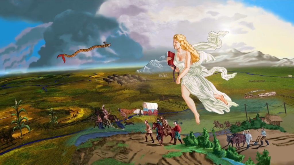 « Pour Destinies Manifest (une animation numérique de 7 minutes), les personnages sont des spectres plutôt que des figures incarnées pour montrer et illustrer la résistance – résistance autochtone, résistance métisse – et aussi l’adaptabilité, c’est-à-dire comment les gens vivaient avant l’arrivée du « progrès américain » », a déclaré M. Leaños.