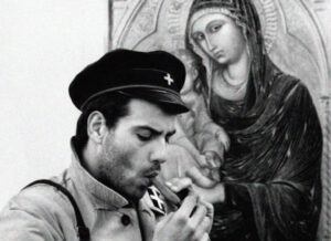 Conçu à partir d’une photographie de Ron Haviv prise à Bijeljina, le 31 mars 1992, dans les premiers jours de la guerre de Bosnie, où vient d’avoir lieu l’un des premiers épisodes d’épuration ethnique, Je vous salue, Sarajevo dénonce l’acte de guerre et la torture.
