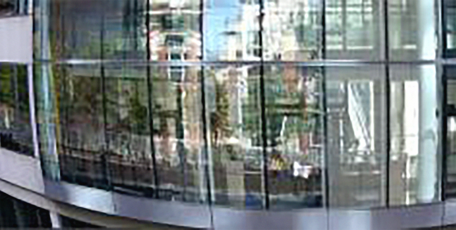« La lumière était belle ce matin là à La Défense. Les reflets ricochaient dans la cité de verre, animant l’espace d’une mobilité écartelée. La caméra a amplifié les courbes, a grimpé le long des façades des tours immenses, les a faites ondoyer au gré du vent. Au fil des heures le ciel s’est assombri, la tempête est arrivée, La Défense commençait à ployer dangereusement… Je suis partie ». Je suis partie. » – Mireille Laplace