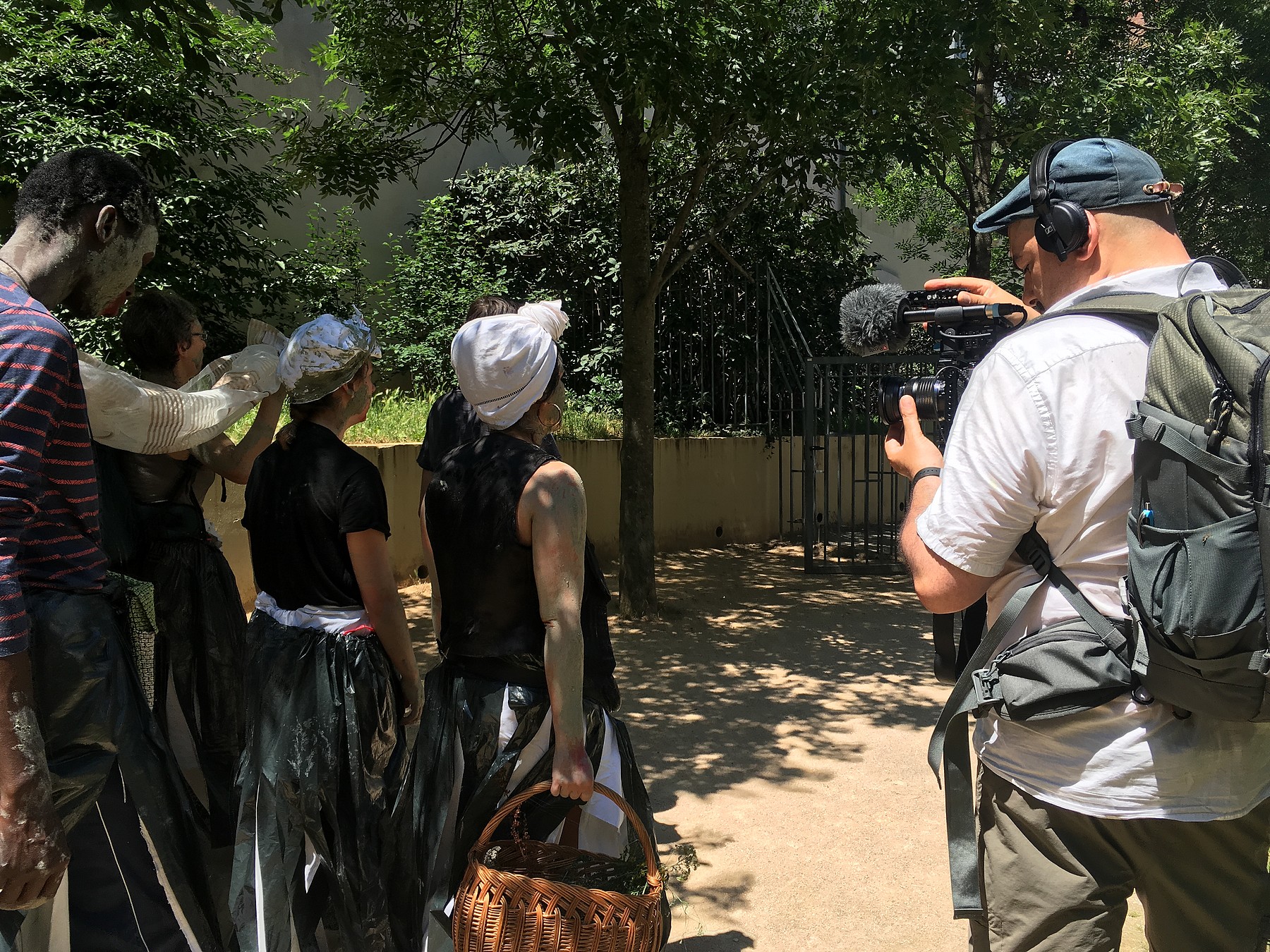 Avec Élise nous avons coécrit le projet de résidences-performances et échangé tout au long du processus sur ce que nous proposions au fur et à mesure aux participant-e-s. Pour le film ce qui m’a intéressé s’est à la fois de rendre compte du processus, mais aussi de prendre part. Je ne suis pas dans le film, mais à sa lisière et dans ses interstices. Il s’agissait de capter des corps qui deviennent un corps, d’enregistrer des voix individuelles qui rejoignent celle d’un chœur/collectif. C’est lorsque nous sommes allés dans l’espace public que je me suis retrouvé au plus près du groupe, à la rencontre de la performance théâtrale et du film.