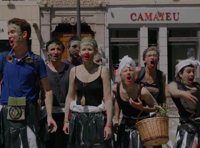 Inspirée par les travaux de Martha Gornika, Maguy Marin et Ephia Gbureck, mais aussi de Nadia Vadori-Gauthier et du Corps Collectif, nous avons invité un groupe de performeurs aux parcours différents à faire-corps-ensemble, à incarner le chœur antique quasi-inspiré sur l’espace public de nos cités dépolitisées et athées. Pour cela, nous nous étions donné l’horizon de performances théâtrales dans l’espace public lyonnais et d’un film documentaire.
