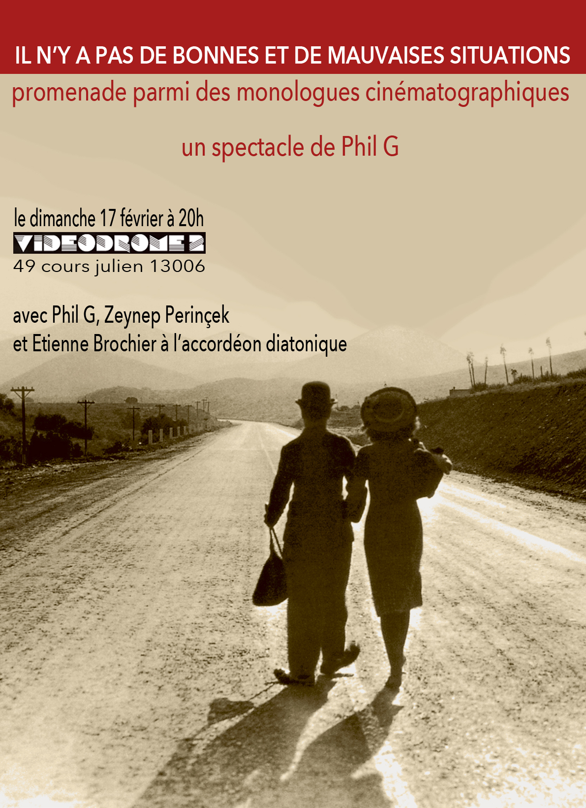 Deux personnages et un accordéoniste, textes et musiques, déambulent dans des monologues choisis en toute subjectivité et mauvaise foi et que vous reconnaîtrez … ou pas.