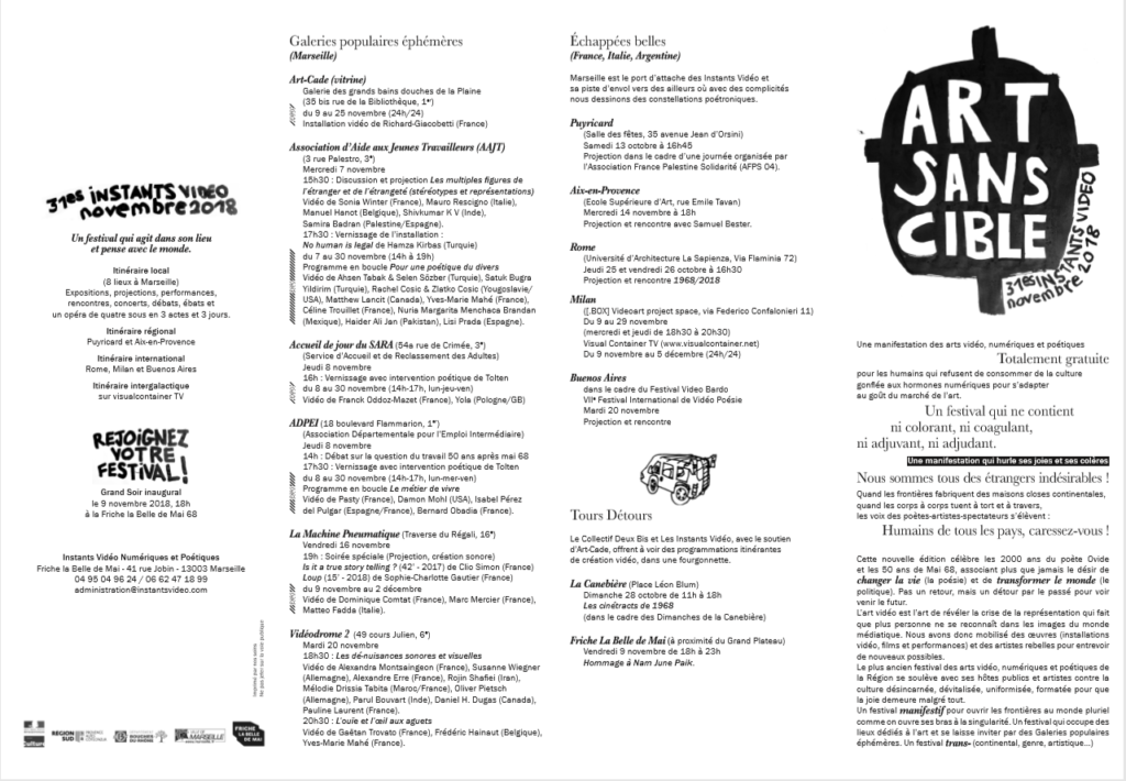 Une soirée en deux temps et plusieurs mouvements pour poursuivre la tournée internationale de ces 31es Instants Vidéo toujours soucieux de briser les frontières pour ne pas briser les rêves et les grèves de nos révoltes intimes ou collectives. Un festival, par les temps qui courent (trop vite), ne peut plus se contenter d’être une vitrine des arts. Il doit affirmer des postures en prenant le risque de s’exposer aux critiques bienveillantes ou pas. Pas la moindre de nos revendications : « pour une semaine de 40h (minimum) d’amour et d’actions poétiques. »