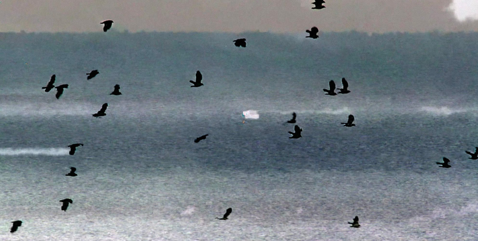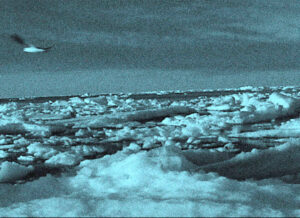 Le voyage de Jacques Perconte est celui d’un plasticien des pixels, qui transforme les lames fracassées sur les côtes en plaques chaotiques, comme posées par le couteau d’une peinture à l’huile, le blanc des falaises projeté sur le brun de la terre, les fumées des usines se mêlant aux champs et qui, dans un retournement cinématographique, entraîne les vols des mouettes en un basculement spatial vers le ciel.