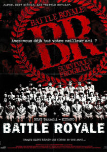 Pour finir, c’est quand même marrant de se dire que Catherine Hardwicke, la réalisatrice de Thirteen, -héritier de pas mal de codes des teen movies indé-, est la même personne qui réalisera plus tard la saga Twilight, superproduction hollywoodienne par excellence dans laquelle Robert Pattinson s’est excusé d’avoir joué. Et le fait de parler de Twilight me permet de faire une transition maladroite pour mentionner le dernier film de la sélection. En effet, Twilight est une saga pour ado, de la même manière que l’est Hunger Games (dont le premier volet est également disponible au vidéoclub), et celui-ci présente de fortes ressemblances scénaristiques avec le roman japonais Battle Royale, qui a lui-même été adapté au cinéma en 2000 par Kinji Fukasaku. On retrouve le même principe de punition étatique sous forme de combat à mort entre ados dans une arène. Sauf que dans le cas de Battle Royale, celle-ci n’est pas la conséquence d’une révolution échouée, mais d’un ras-le-bol de l’éducation nationale qui estime que les jeunes d’aujourd’hui ont perdu toute notion de respect, et envoie donc toute une classe de lycéen.nes sur une île isolée de l’archipel afin de s’entretuer dans le but de redonner aux adolescent·es nippon·es le goût de l’autorité et des valeurs traditionnelles. TW beaucoup de sang.