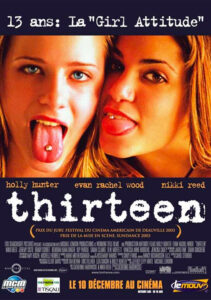 Dans la catégorie teen movie fuckep up, Gregg Araki est sans conteste le roi. Un des films de sa Teenage Apocalypse Trilogy s’appelle d’ailleurs Totally F***ed up, mais c’est le seul qu’on n’a pas au vidéoclub. En revanche, nous avons les deux autres, Nowhere et The Doom Generation, manifestes queer post-punk dans lesquels on suit les pérégrinations de jeunes adultes nihilistes, « enfants du sida et de MTV » selon les mots de Gregg Araki. Ce genre de teen movies indépendants sont également l’apanage d’un autre rendez-vous régulier du Videodrome 2, intitulé Dark Sweet Sixteen, qui se concentre comme son nom l’indique sur les aspects les plus sombres de l’adolescence. Le vidéoclub est par ailleurs riche de plusieurs films de ce type, caractérisés par une volonté de représentation plus proche du naturalisme, dont par exemple Elephant de Gus Van Sant, Spring Breakers et Gummo de Harmony Korine ou encore Bully et Another day in Paradise de Larry Clark. Ce dernier est par ailleurs l’auteur de Wassup Rockers, ici présent dans cette liste, dans lequel on suit la rencontre d’une bande d’adolescents latino-américains issus des quartiers populaires de South Central, fan de culture punk et de skate, avec des jeunes filles riches de Beverly Hills. Il est filmé à la manière d’un documentaire avec un acteur non professionnel (Jonathan Velasquez) en rôle-titre, permettant ainsi d’amener cette dimension plus brute et spontanée propre à l’approche réaliste, ce que l’on retrouve aussi dans Thirteen (2003). Ce film explore les relations complexes et toxiques de l’amitié entre Tracy (jeune fille sage blonde) et Evie (jeune fille rebelle brune), et examine les dynamiques de cette relation marquée, sans surprise, par le dévergondage de la première par la deuxième, et par une forme d’emprise/fascination/désir amoureux-sexuel de Tracy pour Evie. C’est un peu comme Respire de Mélanie Laurent mais avec un peu plus de style, du fait notamment de sa photographie contrastée caractéristique d’une D.A. générale orientée pop-punk/early y2k (aucun de ces n’existent dans la Bible).