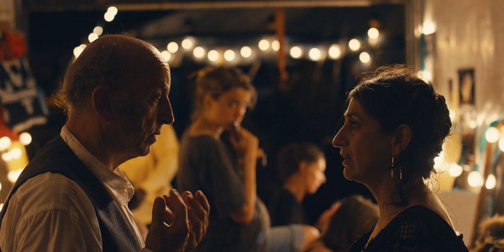 « Les premières secondes du film sont presque silencieuses, la caméra frôle une équilibriste, on entend à peine la musique, quelques paroles, puis, le champ s’élargit, nous sommes sur la scène d’un théâtre itinérant. Alors la musique et les comédiens envahissent l’écran, une mariée kusturikienne est portée en triomphe par une bande de comédiens ivres ou jouant l’ivresse, on ne sait plus, ça gueule, ça crie, ça boit à la santé de la mariée, les spectateurs de la pièce sont invités à vider leur verre de vodka, la caméra passe d’un acteur à un autre, on suit dans le même mouvement une actrice sortir de scène, un acteur se préparer dans les coulisses qu’un simple rideau sépare de la scène. Dans la salle le spectateur est vite emporté dans cette tornade dont chaque plan semble volé mais dont on comprendra vite qu’ils sont composés avec la plus grande des maitrises. Les Ogres vient de débuter, pendant 2h30 qui fileront comme une fête très arrosée (et sans la gueule de bois), nous aurons l’impression de faire partie de cette troupe de comédiens itinérants qui jouent Tchekhov à travers la France.