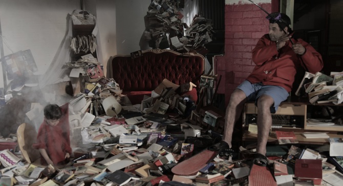 Gérald teste un vieux radio-cassette. Matthieu range ses livres. Ali se penche pour ramasser une poupée tombée d’une étagère.