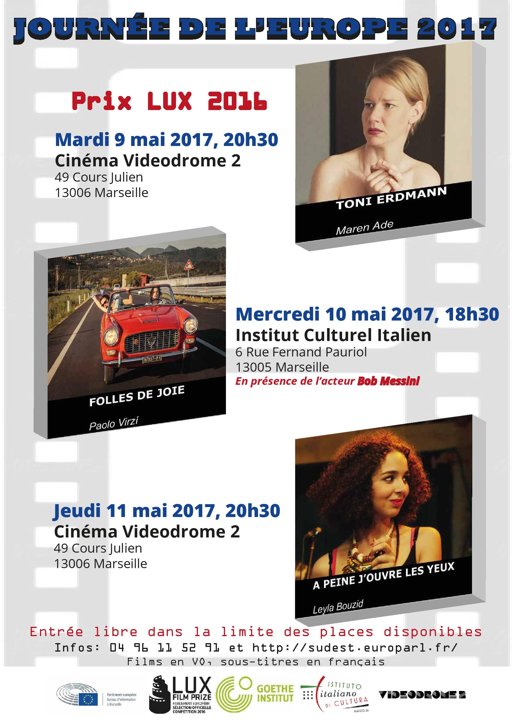 Dix films, 28 pays, un seul prix. Le 23 novembre dernier, Toni Erdmann a remporté le Prix Lux 2016. Cette co-production allemande, autrichienne et roumaine a été récompensée à l’occasion des 10 ans d’existence de ce prix cinématographique remis chaque année par le Parlement Européen depuis 2007 et permettant au film sélectionné de vivre dans les 24 langues de l’Europe. Détour par cette initiative culturelle d’ouverture et de voyage des cultures pour La journée de l’Europe 2017 grâce et à l’initiative du Parlement Européen et en partenariat avec le Goethe Institut Marseille; Toni Erdmann et A peine j’ouvre les yeux (film finaliste) seront diffusés pour l’occasion. En présence de Bob Messini, vous pourrez également découvrir Folles de joie de Paolo Virzi à l’Institut Culturel Italien le mercredi 10 mai à 18h30.