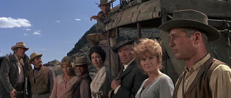 Une palette des caractères humains, cinq hommes et trois femmes, réunit dans une dilligence. Hombre s’inspire du chef-d’œuvre de Ford, La chevauchée fantastique, même si l’essentiel du voyage se fera à pied. Mais Ford n’est peut-être pas la seule source d’inspiration de ce Western de style classique tourné à une époque où le mouvement du Western crépusculaire est déjà bien engagé. L’Apache au visage pâle incarné par Paul Newman, qui tourna six films avec Ritt, sait que son monde est inconciliable avec celui des Blancs dont il ne peut rien attendre, comme le Massai de Bronco Apache de R. Aldrich, interprété par un autre Indien aux yeux bleus, Burt Lancaster. Quant au méchant, campé par Richard Boone, sans doute l’un des plus réussis de l’histoire du cinéma, il évoque irrésistiblement, et perfectionne, celui de L’homme de l’Arizona (The Tall T) de Budd Boetticher.