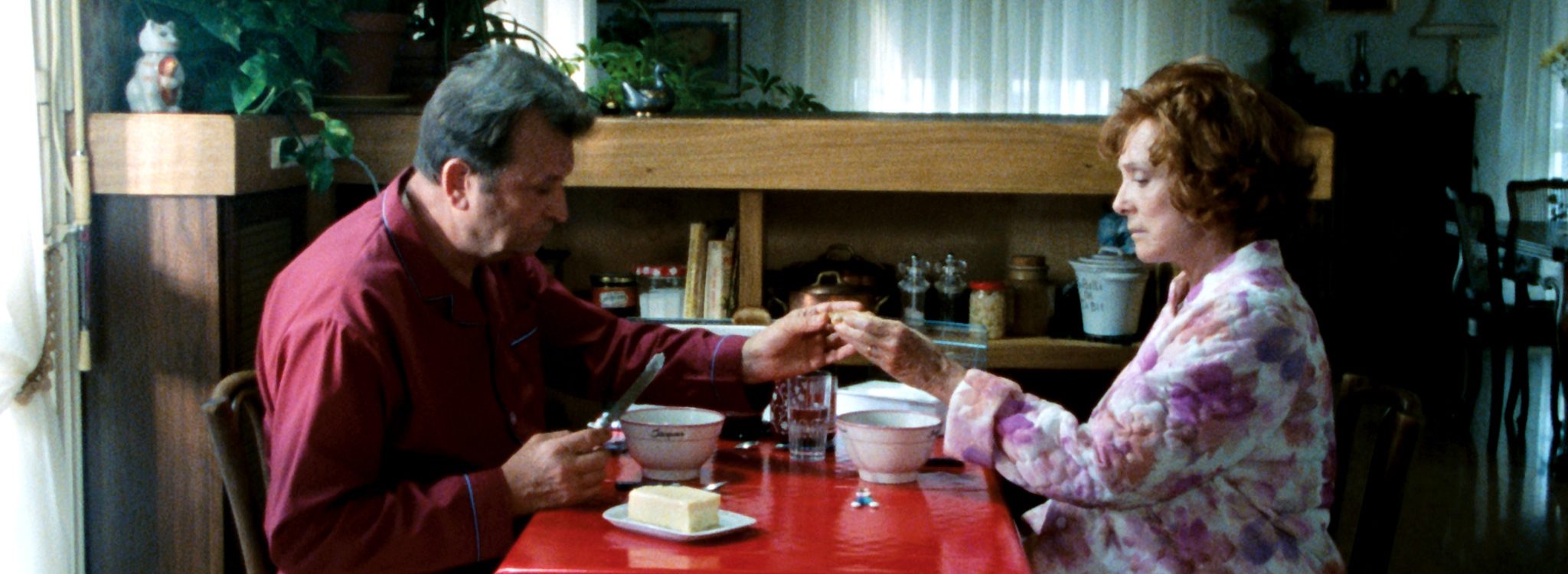 Y’a vraiment des types pas comme les autres. Pour son premier long métrage en 1985, Gérard Frot-Coutaz, de la bande à Diagonale (Vecchiali, Biette, Guiget, Treilhou…), décédé en 1992, auscultait le vieillissement avec de faux airs de vaudeville porté à l’écran, accostant sur des rives cruciales et rarement abordées, s’attaquant à la carcasse récalcitrante des vieilles névroses de couple avec une rare perspicacité. Frot-Coutaz, en compagnie de Jacques Davila, écrivit pour des acteurs dont il rêvait, Micheline Presle et Claude Piéplu, dont le duo met en évidence de désarmantes réalités. Jacques et Jacqueline sont deux anciens instits qui attendent leur fils Bernard (Xavier Deluc) accompagné d’une dénommée Brigitte (Tonie Marshall) à déjeuner, pour lequel ils ont décidé de faire un poulet, désigné illico comme running gag et objet transitionnel. Cet homme et cette femme, intelligents, qui s’aiment indubitablement, vivent à l’âge de la retraite un enfer permanent. Ce que décrit Frot-Coutaz avec la tendresse d’un humaniste et le scalpel d’un entomologiste, c’est un drame quotidien dont personne ne parle jamais, vécu par des millions de gens, considéré avec un haussement d’épaules comme faisant partie de la vie. Jacques et Jacqueline ne se comprennent plus ou trop bien, ils sont des étrangers trop familiers qui se livrent une guerre sans merci (laquelle serait possiblement un pis-aller à la peur du vide). L’hystérie féminine, cette déception-mais-de-quoi, cet épuisement dépressif qui habite tant de femmes passées la soixantaine est clairement désigné du doigt, sans méchanceté, avec un effarement lucide. Qui est ce monstre égotiste et flippé qui ne laisse pas respirer ses proches, ce moulin à paroles, à peurs et à obsessions qui désherbe toute tentative d’exister à trois lieux à la ronde ? Est-ce la facture de la domination masculine que les femmes sortent sur le tard ? Serait-ce ovarien ? Un film important si on s’intéresse au genre humain hétéro, occidental, instruit.