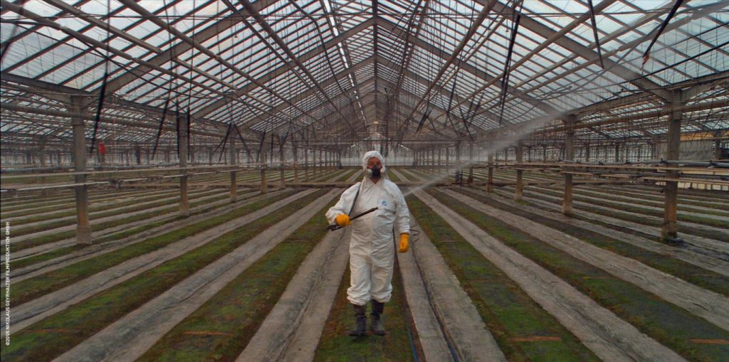 Alternant plans fixes et lents travellings, le cinéaste brosse une série de tableaux futuristes, comme sortis d’une imagination malade. Dépeçage des porcs, ramassage des choux ou triage des poussins : rien ne nous est épargné, mais tout est horriblement sublimé. Dans cet univers privé de paroles et saturé de nourriture, les abattoirs briqués succèdent aux serres immenses et les combinaisons high-tech frôlent les chairs à nu.