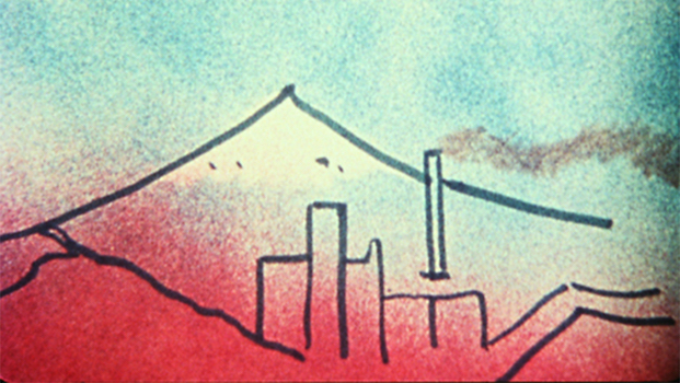 Réalisé une quinzaine d’années après A Man and His Dog Out for Air, Fuji est l’exact contrepoint des transformations graphiques de ce dernier. Le mont Fuji y tient bien sûr un rôle crucial – son profil graphique au centre de l’image, plus ou moins stabilisé, suivant la progression du film. Breer substitue à la puissance des métamorphoses et au jeu des métaphores les déclinaisons subtiles d’un schème graphique et d’une figure type.