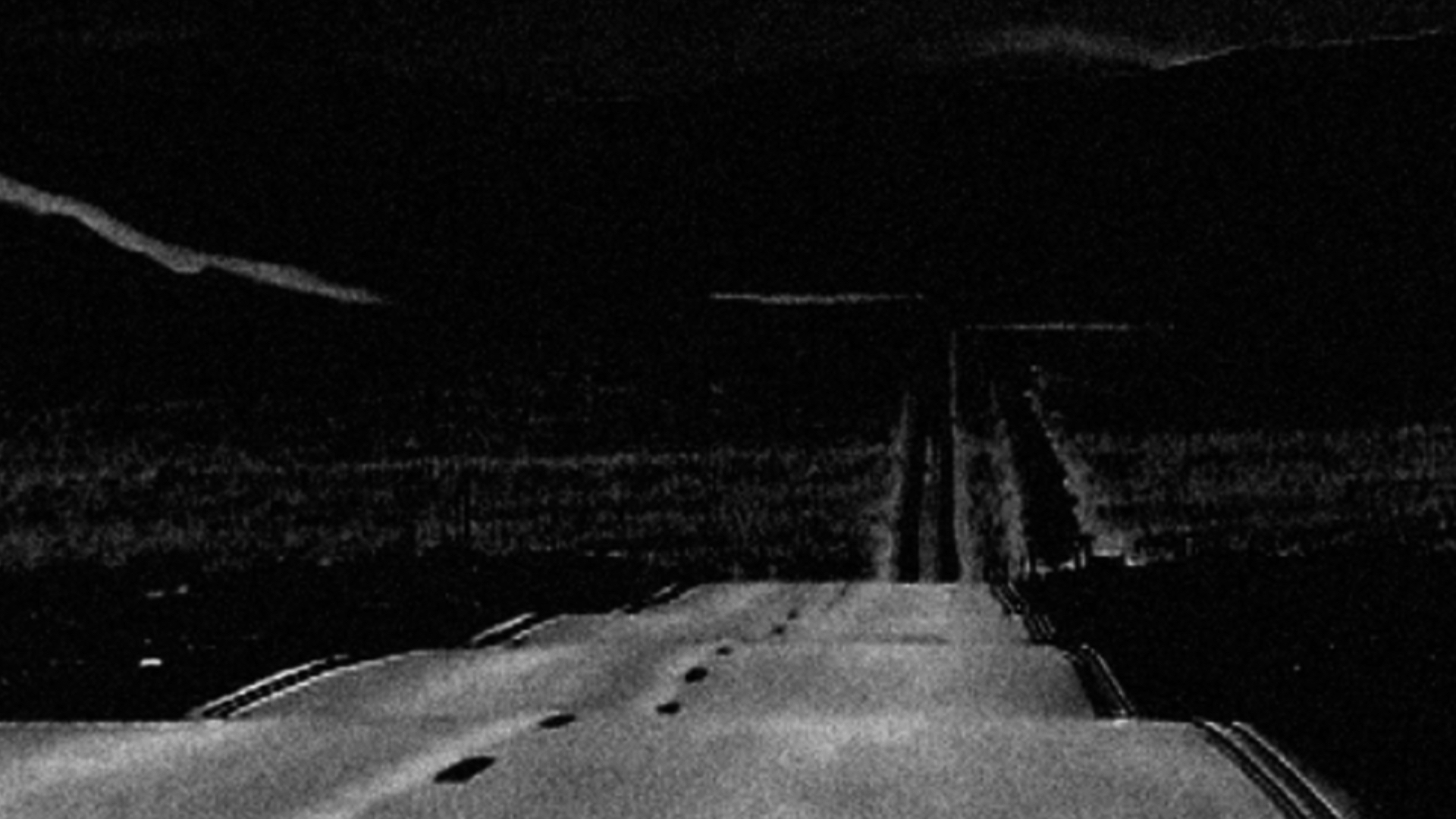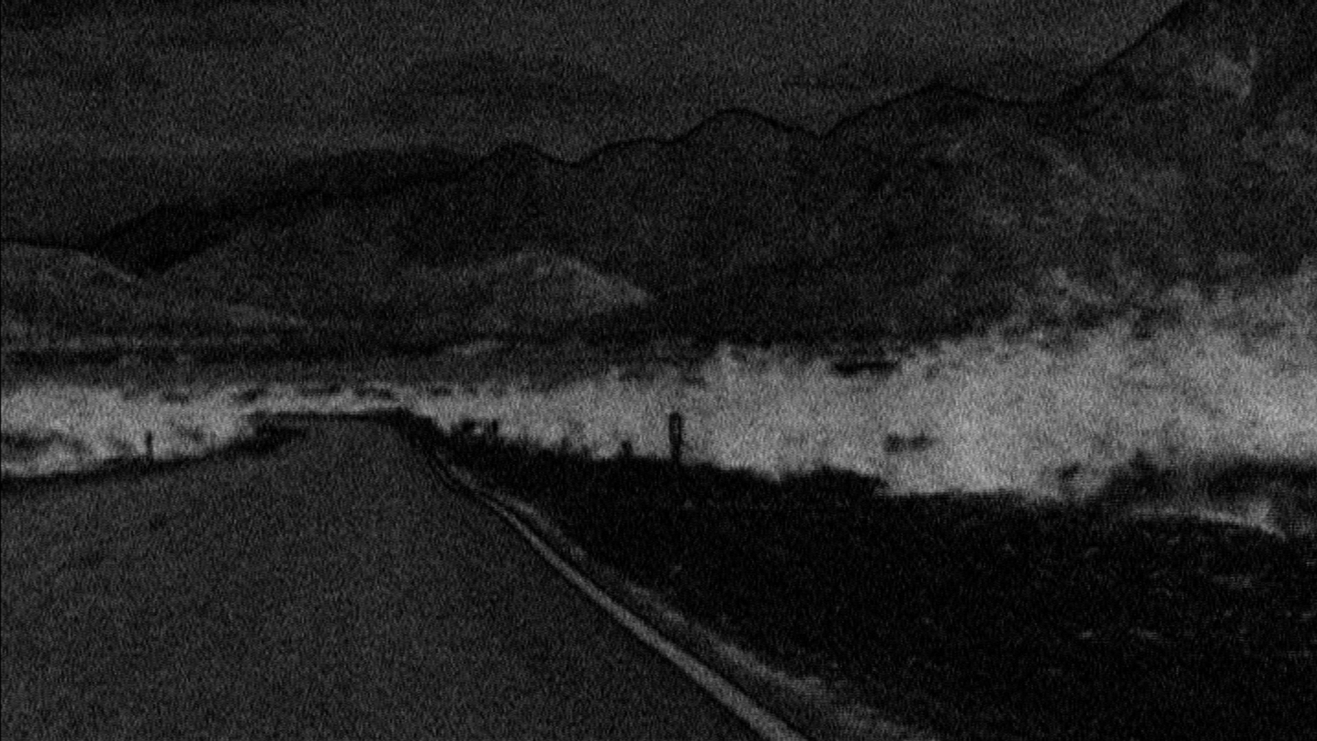 Le film repose sur un plan subjectif et direct de l’asphalte de la route, où la bande centrale apparaît. Disparaissant tantôt derrière un monticule, elle refait surface peu après et pour conduire à la colline suivante. On dirait que quelqu’un dispose un aride paysage de steppe sur les côtés, élève doucement une montagne à l’horizon. Le développement numérique transpose le tout en un négatif noir et blanc tremblant, comme des pastels à l’huile sur un tableau noir. Ce sont à peine 2 minutes 30 d’un voyage nocturne en terrain vague, enveloppé dans le son étrange et fébrile d’Andreas Berger. L’asphalte tremble et l’horizon s’allume. Le moteur râle et la vue se trouble. Un voyage imaginaire. Film noir. Carte noire. Dans la libre inspiration de David Byrne, nous sommes sur la route de nulle part. Le petit hibou attend.