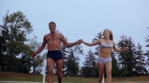 Que l’on lance un désir sur un point donné, il se perdra dans les méandres de la grille de l’espace-temps et fissurera la toile de son passage, laissant cadavres et fantômes arborer la marche des rencontres jusqu’à se retourner sur lui-même pour constater sa propre défaillance ou son inexistence. Ainsi le nageur décide de nager dans toutes les piscines qui le sépare de sa maison et redécouvrira son existence à travers ce voisinage planté de travers, où la fatuité règne et où l’amour est impossible et vain car irrémédiablement perdu. Ce corps triomphant, symbole d’une certaine Amérique impériale se verra dégommer tous les points de fuite qu’il rencontre en les retournant pour ce qu’ils sont, déception, nostalgie, consumérisme, hypocrisie, alcoolisme, fatuité et mesquine cruauté.