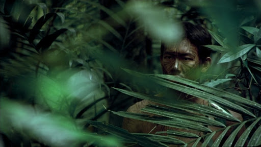 Le plan, on y entre doucement, par le bas s’il est un peu surélevé, ou par le fond, détaché d’un élément. Symétriquement, on ne sort pas du plan, ce serait surligner et aiguiser ses bords. On s’y évanouit. Ayant signifié à Keng qu’ils ne se reverront plus, Tong s’enfonce dans la profondeur, absorbé par la nuit où s’estompe la perspective. Dans Tropical Malady, on ne rompt pas, on s’efface. Et lorsque, au milieu du film, un conte prétend s’abattre comme une herse céleste sur ce havre, c’est conformément à cette économie du moindre signe qu’il n’y fait pas le chambard annoncé. Laissant quelques intertitres prendre en charge le récit, Joe n’en retient pour son cadre que des traces sommaires : empreintes au sol, tronc griffé, merde survolée de mouches. Voilà comment la terrible bête s’épingle dans le champ. Doucement, doucement. L’ajout de conte, c’est quoi au fond ? Un singe et un tigre, les mêmes qui en première partie auraient pu apparaître en raccord de regard d’une déambulation amoureuse. Sauf qu’aux cris aigus de l’un on accole des sous-titres, et aux moustaches immobiles de l’autre une voix-off. Entre le réel et sa légende il n’y a que le dépôt feutré de deux ou trois signes.