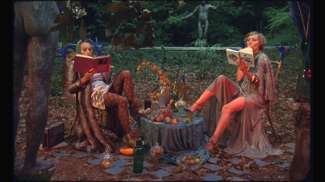 Les films de Bertrand Mandico sont comme des films qu’on aurait vus en rêve et dont on dirait : « J’étais dans une salle de cinéma qui était également un temple orphique plein de statues humaines et nous y assistions à la projection du film d’un très vieil enfant visionnaire qui était aussi l’invocation rituelle d’une déesse : la déesse de la chair luxuriante, des fruits qui mûrissent et des fleurs qui fanent. » Dans Prehistoric Cabaret, où Elina Löwensohn danse entre des fantômes otto-dixiens et george-grosziens de spectateurs déclinants, alcoolisés, énervés et excités, la pénétration dans les strates les plus profondes de l’être fonctionne comme le poème-pianobastringue de l’art devenu planétarium érotique, érotarium sacrificiel. Dans Y a-t-il une vierge encore vivante ?, Elina Löwensohn est une Jeanne d’Arc aux yeux crevés, préraphaélite et f’murrresque, hiératique comme une demoiselle Mordred dans son armure d’argent. La forêt est sauvage, venteuse et murmurante comme un vers de Rimbaud. Dans Notre Dame des Hormones, Œdipe est un vieillard aux longs seins. Dans un palais de cauchemar, Nathalie Richard et Elina Löwensohn jouent la variation apocryphe d’un Baby Jane archaïque, pétillant et traître comme un cocktail ; un épisode oublié de Céline et Julie filmé dans l’Italie d’un monde-miroir où pousse un vieux morceau de chair. Les couleurs collent aux corps comme du miel sur les paupières pourpres des anges. Chaque image de Bertrand Mandico que nous sommes amenés à découvrir est déjà mythique, inimaginable et instantanément inoubliable. Le sang, l’or, la cire et les alcools y coulent comme des larmes. Tout y est inquiétant et sublime, tourmenté et consolateur.