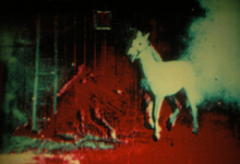 Berlin Horse est une synthèse de travaux qui explorent la transformation de l’image en refilmant à partir de l’écran, et en utilisant des techniques complexes de tirage… La musique du film est composée par Brian Eno et comme tous les éléments de l’image, elle explore l’irrégularité des boucles entre elles afin de changer leur phase.