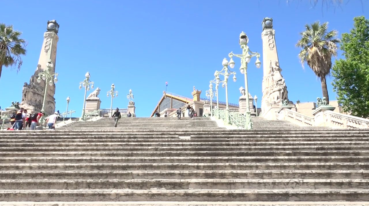 L’escalier de la gare Saint-Charles, à Marseille. Le regard s’arrête sur ce lieu de passage, moments de rencontres suspendus dans l’espace.