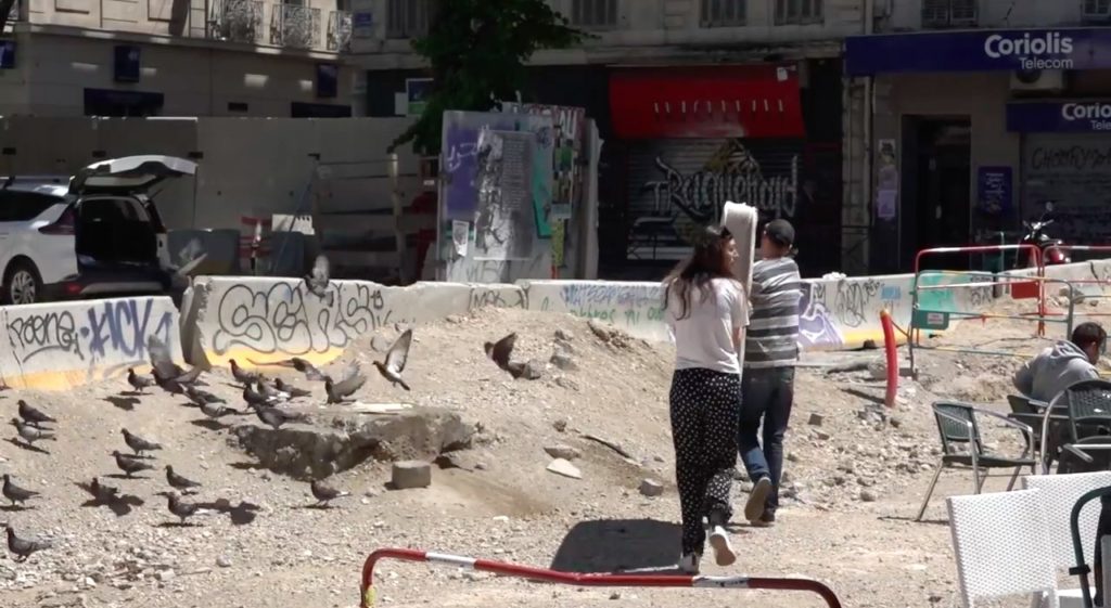 Marseille, place Jean Jaurès. Il y avait une place, il y a maintenant un mur de béton. Tandis que les engins de chantier occupent l’espace, la parole des habitants reprend ses droits.