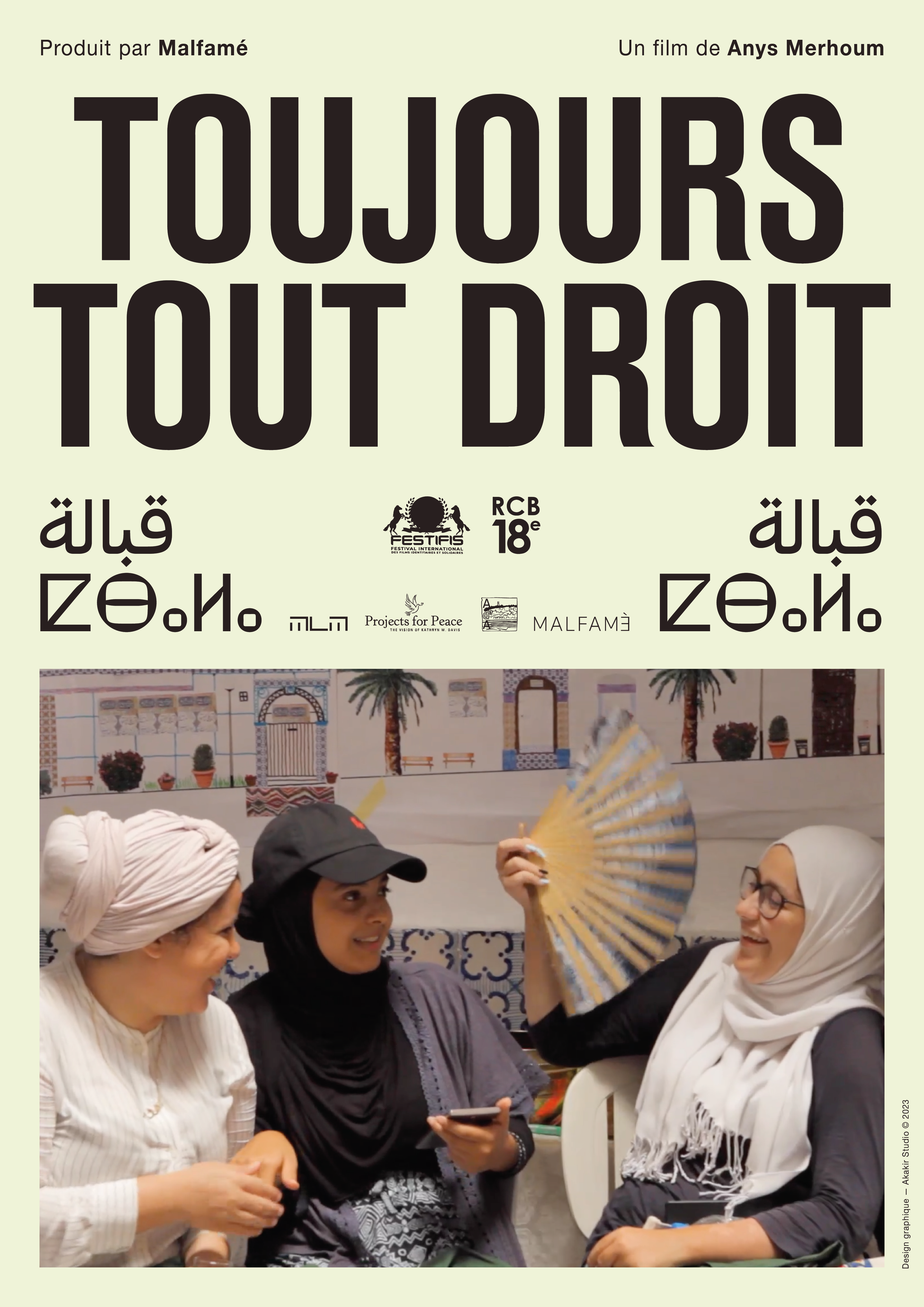Tourné à Alger, lors d’une session d’ateliers urbains participatifs organisés par l’association les Ateliers d’Alger et regroupant des résidentes de quartiers populaires d’Alger, Toujours Tout Droit (Qbala Qbala قبالة قبالة) relate leurs témoignages, donnant ainsi la parole à ces femmes que l’on n’entend jamais. Il propose un regard social, une déambulation urbaine et un éclairage historique sur la ville d’Alger, racontée du point de vue de ces femmes rassemblées pour l’occasion dans une maison historique de la Casbah d’Alger.