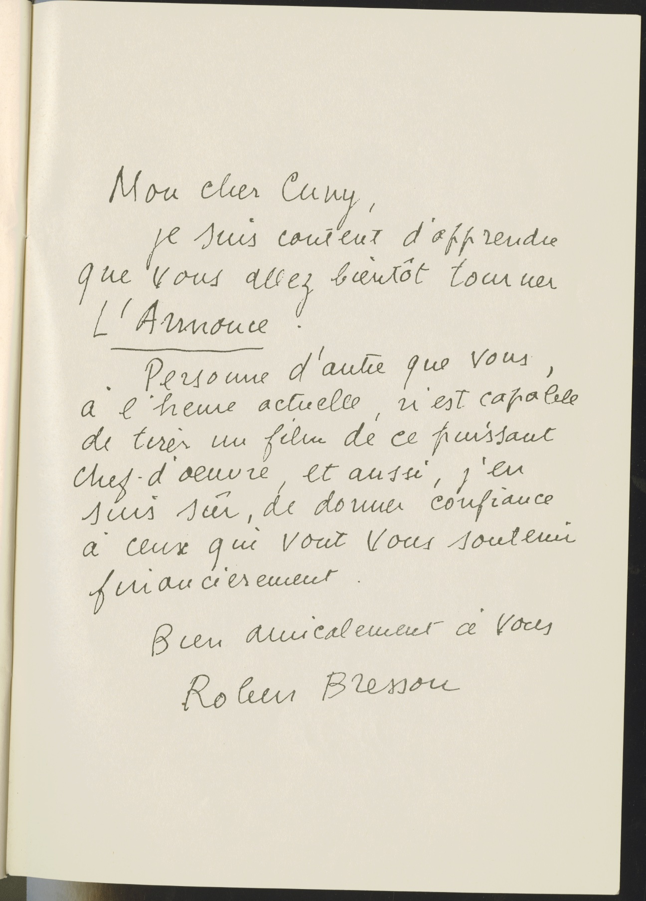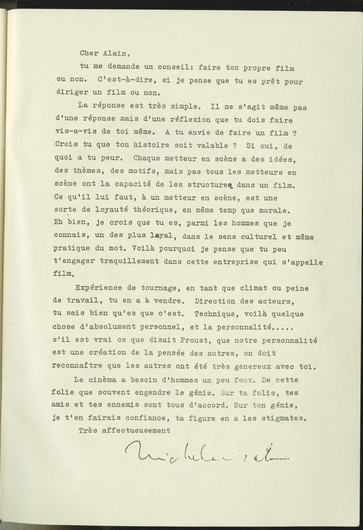 « Que vous soyez arrivé du premier coup à l’essentiel, que vous ayez (j’en suis sûr, d’instinct plus que de méditation) trouvé la distance juste, parfaite, avec un texte qui est posé sur le film comme un fil-de-ferriste (un pas de côté, c’est la chute), que vous ayez en somme inventé la seule manière de faire vivre et écouter ces personnages dans l’univers piégé du cinématographe, c’est de l’ordre du miracle. »
